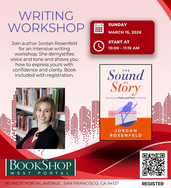 Sunday, March 15, 10 am. Join me for another Sound of Story Workshop in San Francisco—Bookshop West Portal.